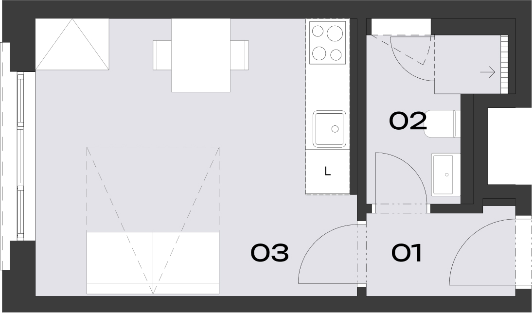 | B8_03.02 | byt | 3.NP | 1+kk | V | 28,9 m² | – / – | – / – | 28,9 m² | 2028 | Rezervováno | |||