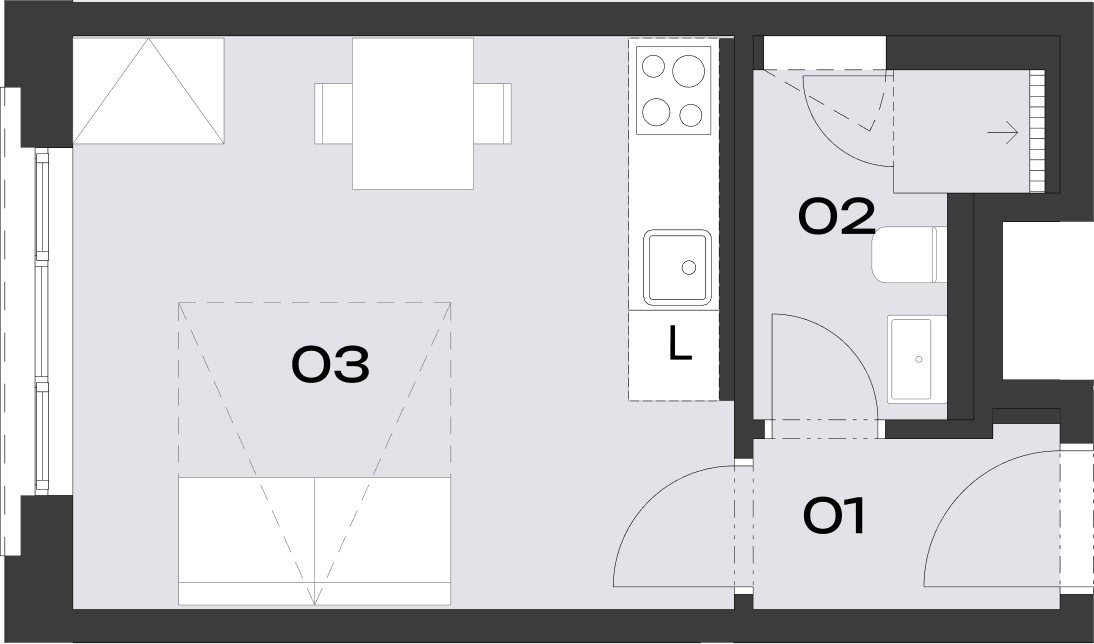 | B8_03.02 | byt | 3.NP | 1+kk | V | 28,9 m² | – / – | – / – | 28,9 m² | 2028 | Rezervováno | |||