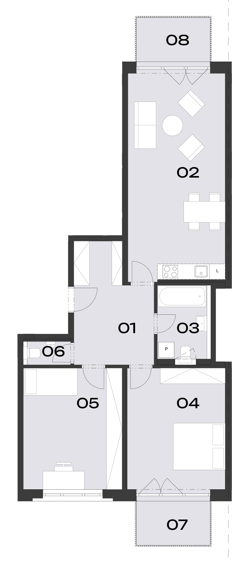 | B8_03.06 | byt | 3.NP | 3+kk | Z | 87,4 m² | 6,6 m² / – | – / – | 94,0 m² | 2028 | Na vyžádání | |||