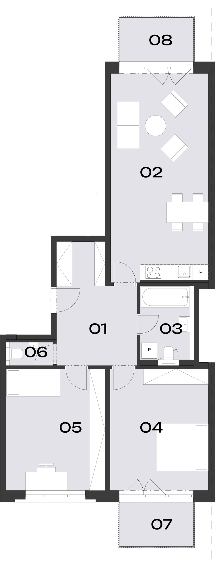 | B8_03.06 | byt | 3.NP | 3+kk | Z | 87,4 m² | 6,6 m² / – | – / – | 94,0 m² | 2028 | Na vyžádání | |||