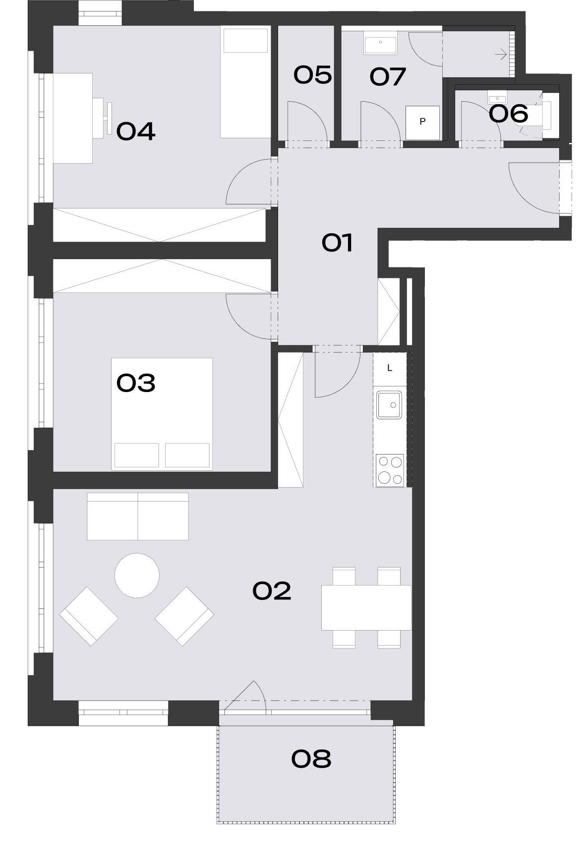 | B8_03.06 | byt | 3.NP | 3+kk | Z | 87,4 m² | 6,6 m² / – | – / – | 94,0 m² | 2028 | Na vyžádání | |||