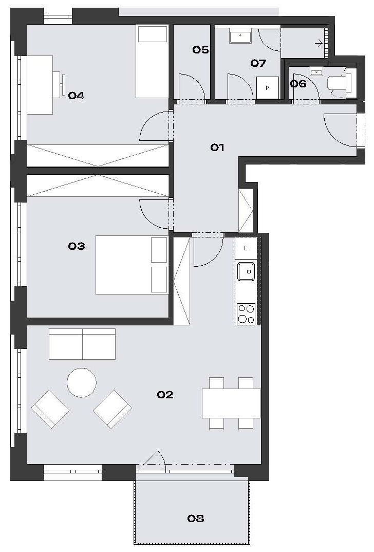 | B8_03.06 | byt | 3.NP | 3+kk | Z | 87,4 m² | 6,6 m² / – | – / – | 94,0 m² | 2028 | Na vyžádání | |||
