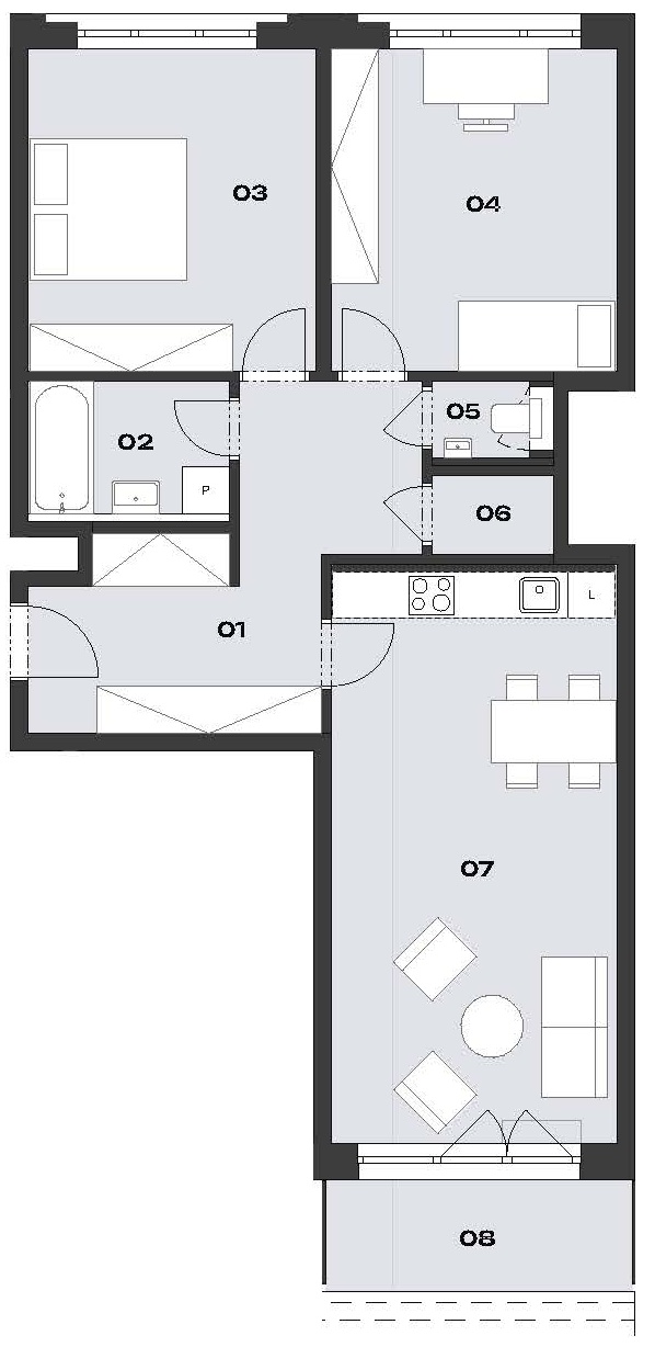 | B8_03.06 | byt | 3.NP | 3+kk | Z | 87,4 m² | 6,6 m² / – | – / – | 94,0 m² | 2028 | Na vyžádání | |||
